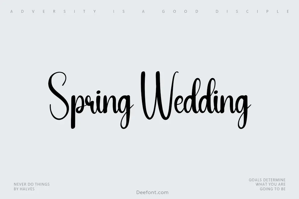 Spring Wedding is a delightful handwritten display font radiating sweetness and friendliness. With charming strokes and playful flair, this elegant script typeface brings a whimsical, romantic touch to any design. Its flowing, light letterforms evoke intimacy and grace, making it ideal for wedding invitations, greeting cards, event stationery, branding, quotes, and decorative text. The signature-style penmanship captures contemporary sophistication while maintaining a personal, inviting quality perfect for love letters, social media graphics, and creative projects seeking cheerfulness and elegance.