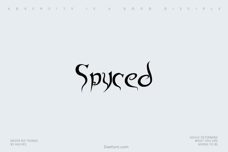 Spyced is a bold and distinctive display font inspired by punk, gothic, and Indian art aesthetics. Featuring sharp, elongated strokes with dramatic curves and spiky serifs, this striking typeface creates a dynamic, aggressive appearance ideal for logos, headlines, posters, and artistic projects. Named after the designer’s sister’s dog, Spyced blends theatrical elements with edgy styling, making it perfect for dark, mysterious, and exotic creative applications that demand an unconventional visual impact.