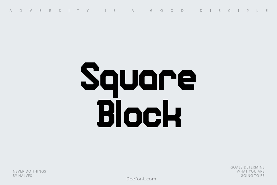 Square Block is a monospaced decorative display font inspired by the architecture of Florence’s suburbs, featuring geometric precision, clean lines, and a massive structure ideal for impactful messages. This techno-styled typeface excels in bold, resolute applications such as advertising, billboards, logos, and headlines, delivering a contemporary aesthetic with strong visual authority. With its semi-expanded width and harmonious balance between sharp angles and proportions, Square Block brings modernity and sophistication to branding projects and digital interfaces.