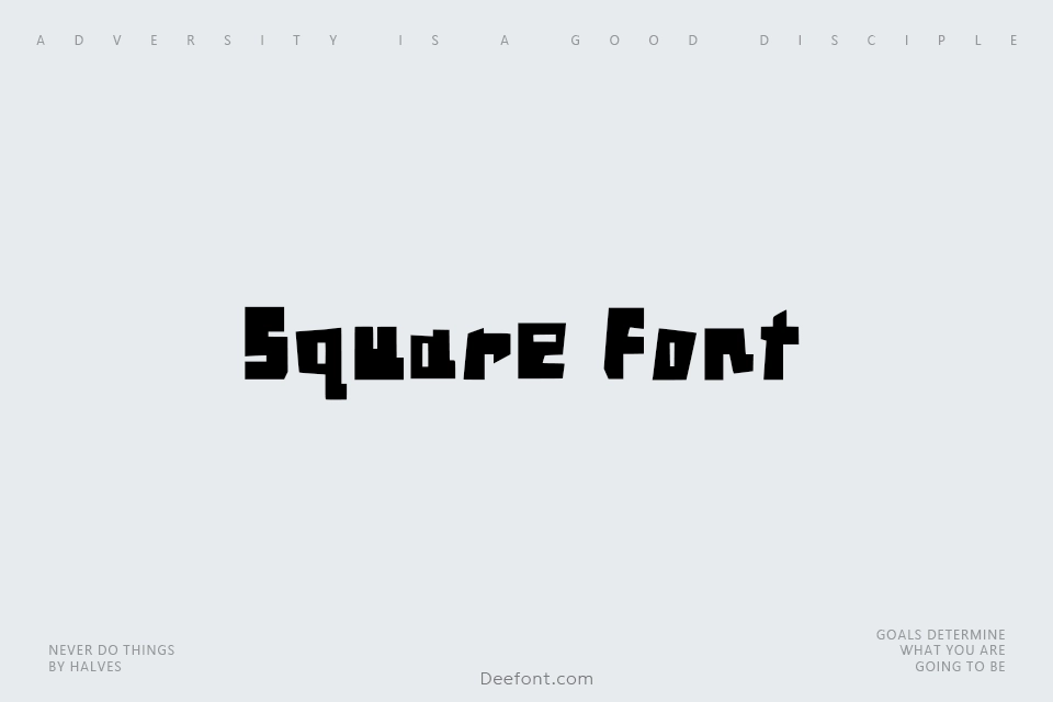 Square Font is a versatile geometric display typeface created with Calligraphr, featuring clean lines and squared edges perfect for headlines, posters, logos, and modern design projects. With its distinctive blocky aesthetic and contemporary appeal, this 100% free font supports 12 languages and offers a bold, impactful visual presence for creative applications. Ideal for branding, advertising campaigns, and any project requiring geometric precision and visual strength.