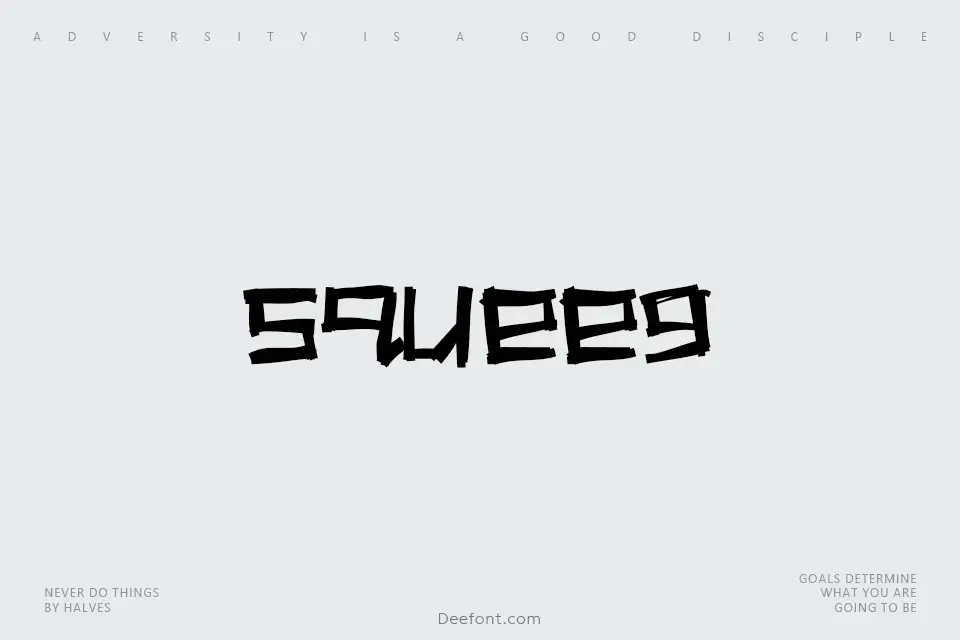 Squeeg is a striking display typeface crafted by independent designer Graham H. Freeman, renowned for its chunky, irregularly-formed characters that evoke hand-lettered graffiti aesthetics. The font features 129 unique glyphs with a playful, slightly imperfect geometry perfect for bold headlines, eye-catching posters, custom logos, and title designs. Its characteristic geometric yet rebellious charm makes it ideal for Halloween graphics, decorative signage, event branding, and any project requiring fun, unconventional typographic energy. The trash script category designation reflects its deliberately raw, sketch-like quality.