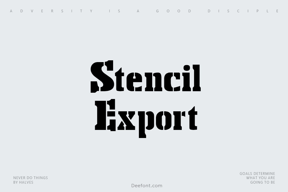 Stencil Export is a bold, industrial stencil font featuring distinct geometric cutouts and strong visual impact. Designed with a rugged, utilitarian aesthetic reminiscent of military and industrial stencils, it combines uppercase and lowercase letters with consistent weight throughout. The font includes 88 carefully crafted characters with special geometric shapes ideal for headlines, signage, and branding projects requiring an authoritative, robust appearance.