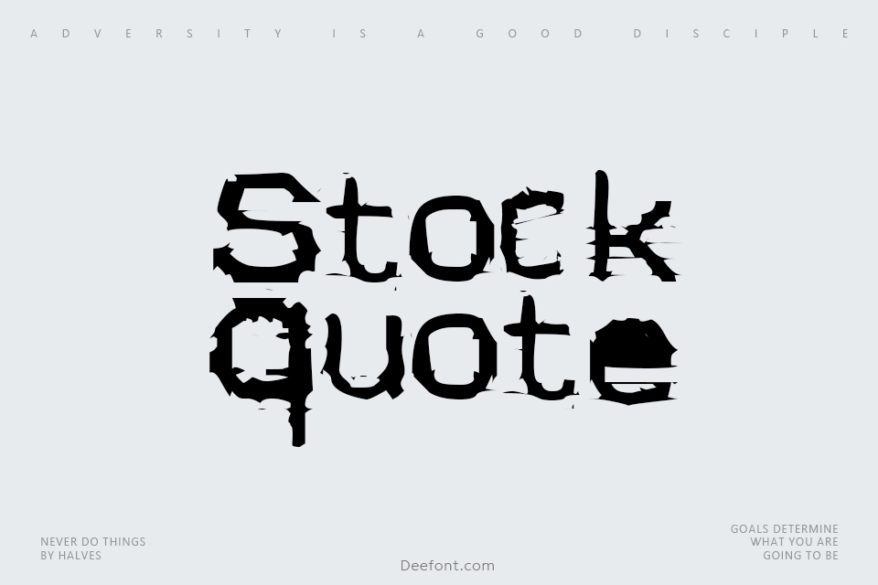 Stock Quote is a decorative display typeface designed by Andy Krahling, featuring a bold and edgy aesthetic with a destroy effect that creates visually striking grungy text. This versatile font is ideal for music album covers, urban-themed designs, posters, and creative projects that require a distinctive graffiti-inspired appearance. With its distinctive distressed character, Stock Quote brings personality and visual impact to any typographic design, making it an excellent choice for designers seeking to add an unconventional and eye-catching element to their creative work.