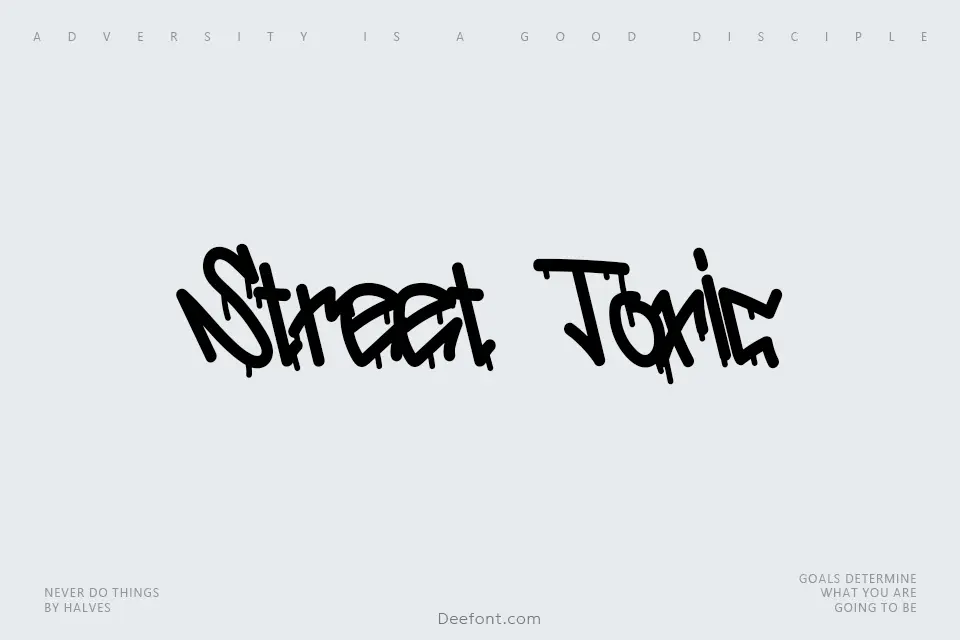 Street Toxic is a bold and dynamic graffiti-inspired display font that captures the energy of street art culture. Featuring jagged lines, sharp angles, and expressive letterforms, this typeface is perfect for headlines, posters, signage, and creative branding projects. With its distinctive urban aesthetic and attention-grabbing presence, Street Toxic brings an edgy, contemporary style to any design. The font supports 59 glyphs and offers a demo version for preview purposes. Ideal for designers seeking to add an energetic street vibe to their typography.