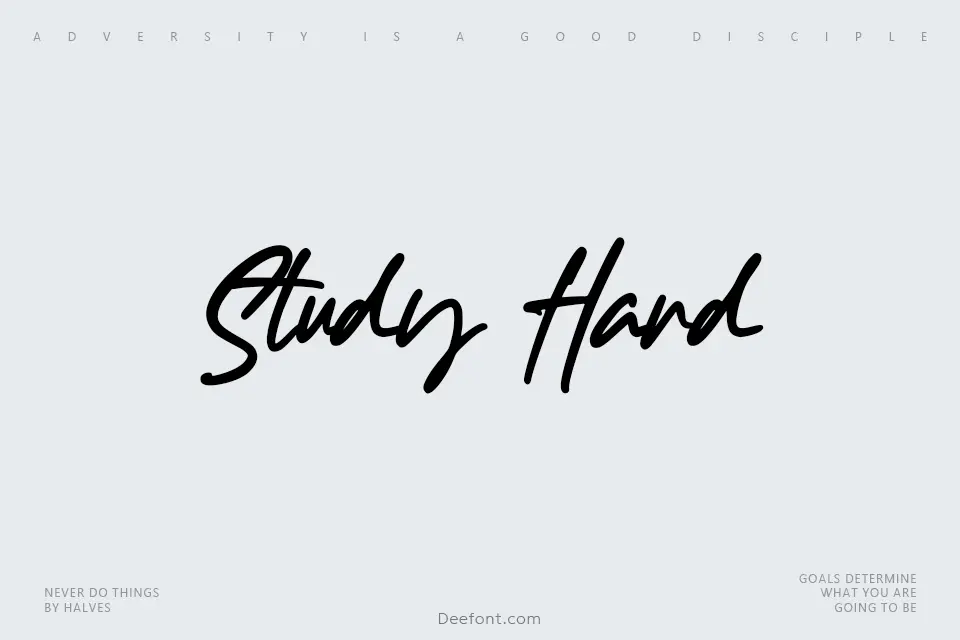 Study Hard is a lively handwritten script typeface designed for maximum visual impact on posters, headings, and display applications. The font features fluid, slightly irregular strokes that convey a personal and informal aesthetic, with connected characters that enhance its cursive appearance. Its expressive letterforms and dynamic weight variations make it ideal for creative projects including event posters, greeting cards, DIY designs, and artistic compositions where personality and warmth are desired.