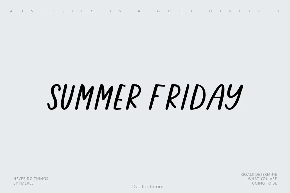 Summer Friday Font is a vibrant handwritten typeface designed with expressive all-caps letterforms that radiate a relaxed, summery aesthetic ideal for creative applications. The font’s casual brush-like strokes and friendly character make it perfect for greeting cards, party invitations, quote designs, merchandise branding, poster displays, and festive event promotion materials. With its playful personality and contemporary handwriting style, Summer Friday brings warmth and approachability to any design project requiring uplifting, informal typography that captures the carefree spirit of weekend creativity.