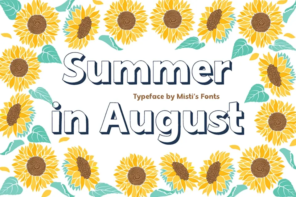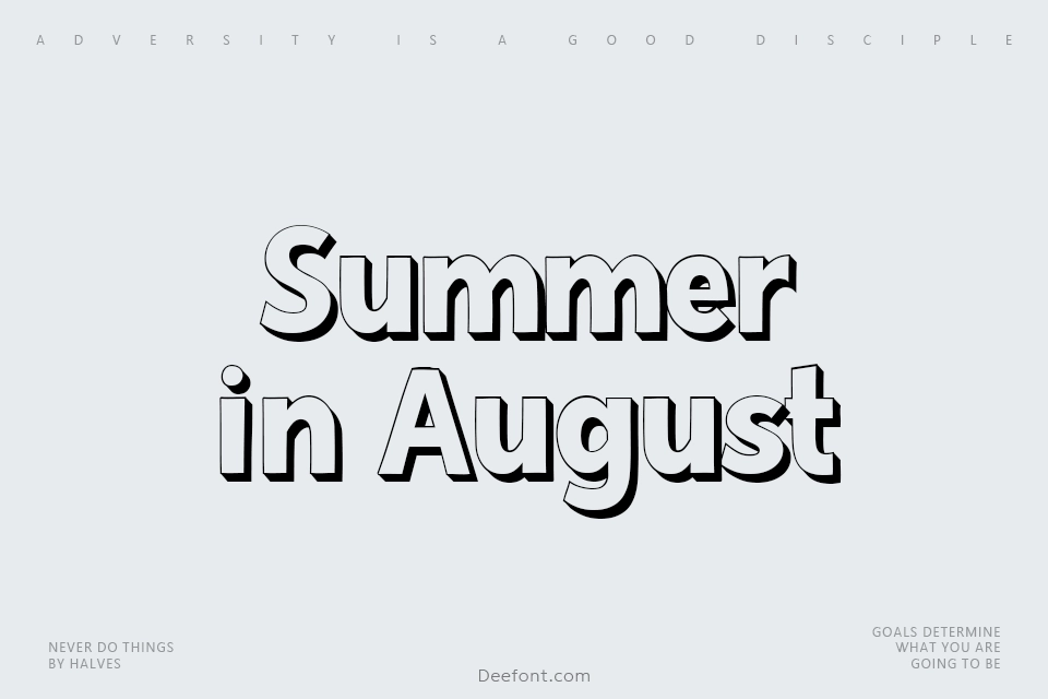 Summer in August is a vibrant outline drop shadow sans serif font that brings a touch of sunshine to your designs. Perfect for eye-catching headlines and playful posters, this typeface features bold, clean lines and a unique shadow effect that evokes the warmth and fun of summer, making it ideal for creative projects requiring visual impact and cheerful aesthetics.