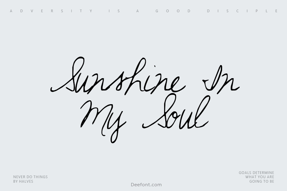 Sunshine In My Soul is a delicate script and handwritten font that brings warmth and elegance to your creative projects. With its flowing letterforms and personal touch, this typeface is perfect for adding a charming, artistic quality to invitations, greeting cards, personal branding, and handcrafted designs. The font combines natural pen strokes with refined character details, making it ideal for projects that require a friendly yet sophisticated aesthetic.