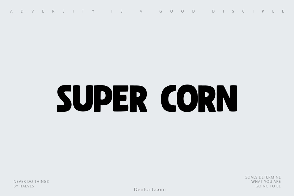 Super Corn is a captivating display font featuring an extra-bold weight with a playful cartoon-inspired style. Designed by fsuarez913, this vibrant typeface brings lively personality to any project. Perfect for children’s book covers, animated movie titles, and eye-catching logos, Super Corn combines bold curves with energetic charm. Its whimsical nature makes it ideal for branding materials that demand attention and leave a lasting impression on viewers.