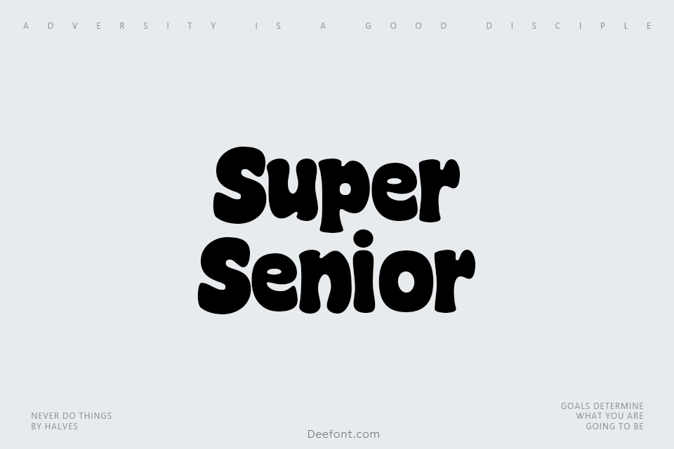 Super Senior is a bold and round display font that brings fun and whimsy to any creative project. With its distinctive rounded letterforms and playful character, this font is perfect for adding personality to your designs. The generous, bubbly shapes make it ideal for eye-catching headlines, posters, and entertaining typography. Whether you’re working on cartoon projects or playful branding, Super Senior delivers the bold, expressive style needed to make your content stand out with charm and vibrancy.