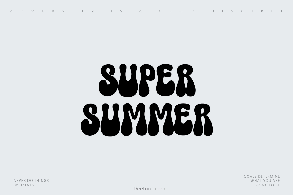 Super Summer is a groovy, retro display font featuring bold, rounded all-caps characters that evoke the fun and playful vibes of the 1960s and 1970s. Perfect for music festival posters, trendy branding, and eye-catching social media graphics, this font delivers nostalgic energy and vibrant personality to every design project. Its condensed, energetic style makes messages stand out with vintage-inspired flair and contemporary appeal.