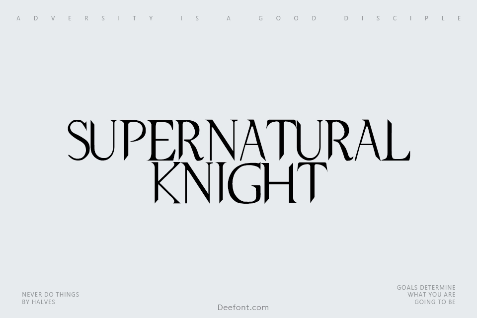 Supernatural Knight is a distinctive Gothic typeface featuring bold, sharp edges and ornamental serifs that creates an elegant yet edgy aesthetic. Designed with uppercase and lowercase letters, this versatile display font incorporates unique textures with contrasting thick and thin strokes throughout its 168 glyphs. Perfect for professional logos, book covers, titles, branding, movie designs, and creative projects, Supernatural Knight delivers a sophisticated Celtic-inspired appearance that commands attention while maintaining readability and contemporary style.