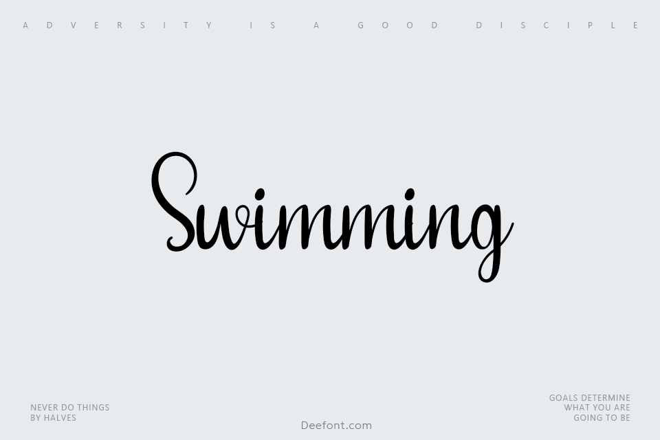 Swimming is an elegant handwritten script font that brings a fluid, natural elegance to your design projects. Created with artistic finesse, this calligraphy-inspired typeface is ideal for wedding invitations, social media graphics, wall displays, logos, and creative branding. Its distinctive style captures the essence of modern handwriting, making it perfect for designers seeking authentic, personalized typography that conveys sophistication and warmth in every letter.
