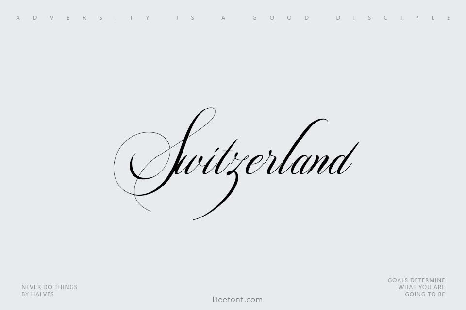 Switzerland is an elegant calligraphy script font designed with copperplate pen techniques and OpenType features. Perfect for wedding invitations, branding projects, and decorative headings, this stylish typeface includes multiple stylistic sets, ligatures, and swashes to add sophistication to your creative designs.