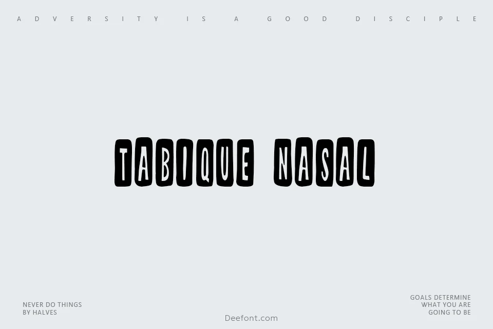 Tabique Nasal is a bold, decorative display typeface featuring characters enclosed in distinctive rounded rectangles, delivering a playful and dynamic aesthetic. Each letter showcases thick strokes with high contrast, making it highly legible for eye-catching headlines and creative projects. Perfect for posters, branding, children’s books, and digital content, this unique font adds personality and visual impact to any design composition while maintaining excellent readability and a quirky, contemporary appeal.
