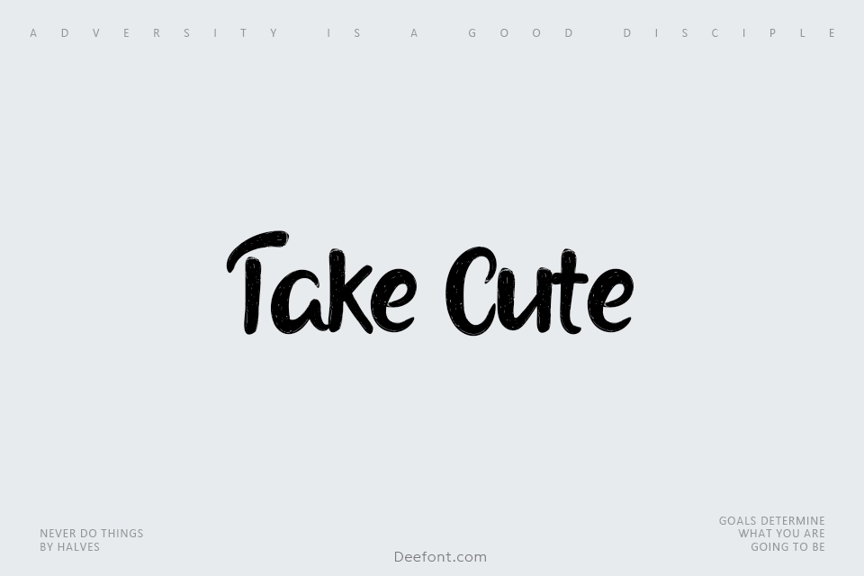 Take Cute is a simple, fresh and friendly display brush font created by Reguler Studio. This charming typeface is perfect for child-themed designs, especially when combined with bright colors. It is also ideal for product packaging, posters, party invitations, and creative projects that need a playful, approachable aesthetic. With its flowing, connected letterforms and brush-painted appearance, it brings warmth and personality to any design work.