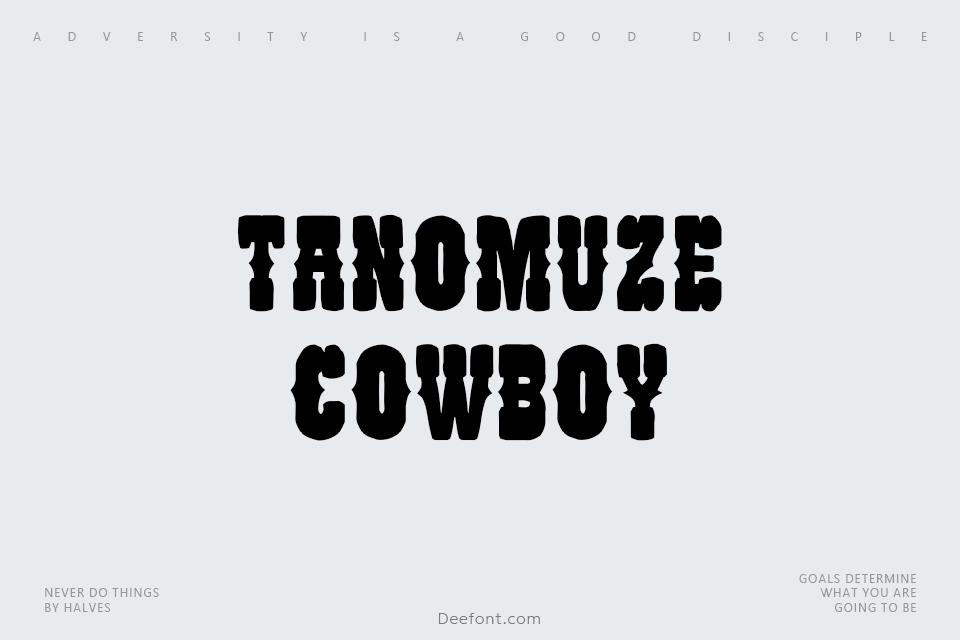 Tanomuze Cowboy is a bold, western-inspired display typeface featuring chunky, slightly irregular serifs that evoke a rugged, vintage feel reminiscent of old Wild West signage. With solid, confident letterforms and strong vertical stress, this font conveys a sense of strength and authenticity. Perfect for titles, logos, posters, and any design needing gritty charm, Tanomuze Cowboy brings an unmistakable frontier aesthetic to your creative projects with its distinctive slab serif structure and playful western character.