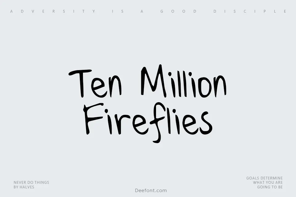 Ten Million Fireflies is a thoughtfully crafted handwritten font featuring a left-leaning fountain pen style with natural stroke weight variation. This display typeface delivers authentic brush-pen characteristics, making it ideal for posters, invitation cards, greeting designs, and creative typography projects. The overlapping letterforms and casual aesthetic bring genuine personality to headlines, greeting cards, and decorative applications, offering both elegance and approachability for designers seeking warm, organic handwriting qualities.