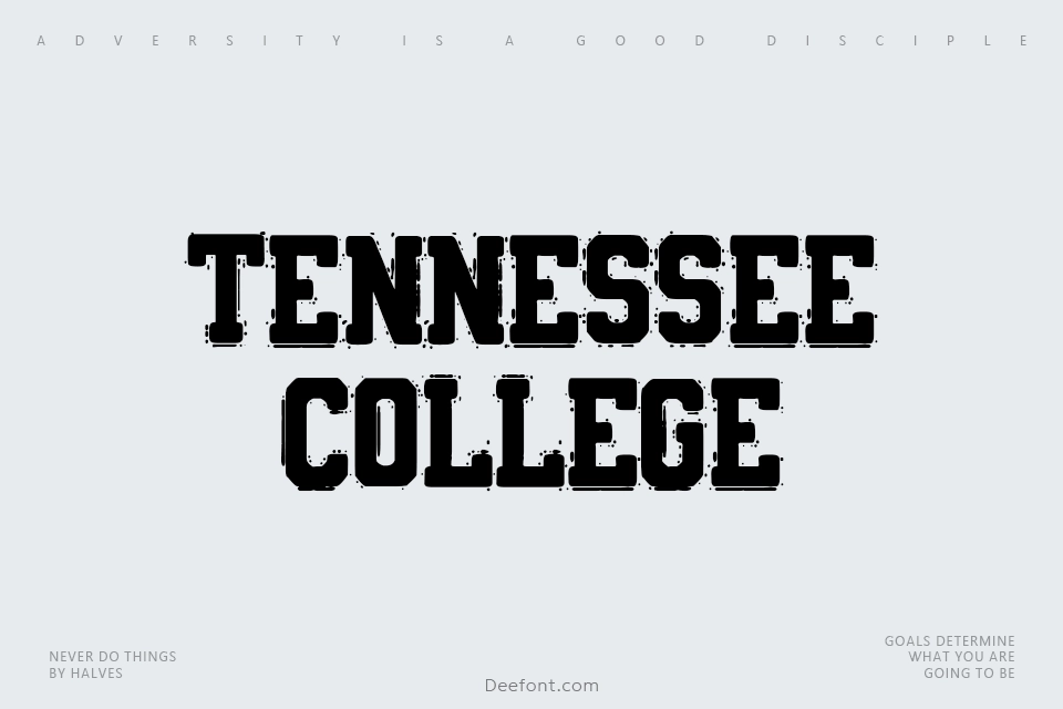 Tennessee College is a captivating display font designed by Woodcutter that exudes old-school distorted charm and nostalgic appeal. With its bold weight and vintage character, this typeface perfectly suits classic rock posters, retro event flyers, tattoo parlor logos, and skateboard brand packaging. The font brings a distinctive edge and eye-catching presence to any creative project, turning heads with its unique distressed style and memorable presence across diverse design applications.