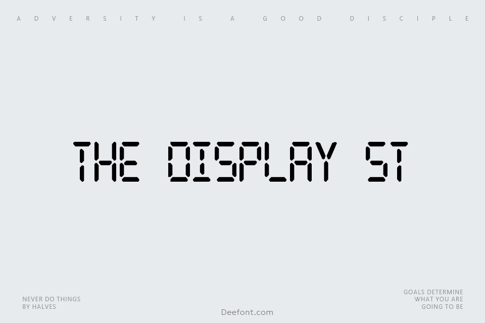 The Display St is a striking LCD display font created by Southype, featuring a techno aesthetic perfect for contemporary digital designs. This versatile typeface excels in creating bold, eye-catching typography for modern projects, from digital interfaces to creative branding. With its geometric letterforms and distinctive technical character, The Display St brings a futuristic edge to any design composition while maintaining excellent readability across various applications.
