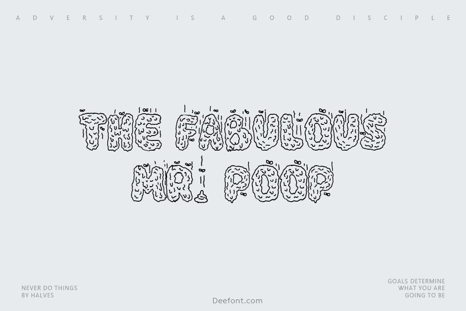 The Fabulous Mr. Poop is a playful and whimsical display font that brings a gooey, cartoonish aesthetic to your creative projects. This decorative typeface features organic, uneven character shapes reminiscent of a quirky, childlike design style. Perfect for children’s books, comic strips, party invitations, humorous posters, and playful branding, this font delivers a lighthearted charm. With its unique personality and fun energy, The Fabulous Mr. Poop makes an excellent choice for designs that require a bold, imaginative touch and a touch of whimsy to stand out.