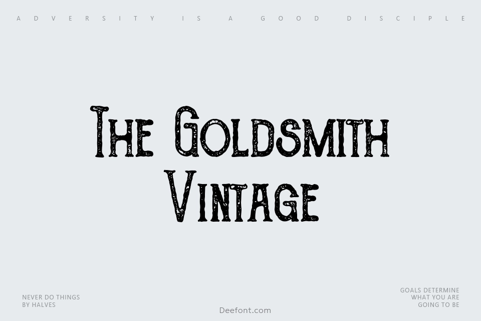 The Goldsmith Vintage is a distinctive vintage-style display font characterized by its distressed, textured appearance reminiscent of classic printing techniques. The font features bold, slightly condensed uppercase letters with ornate decorative elements that evoke a handcrafted quality. Its weathered aesthetic makes it ideal for retro branding, vintage posters, packaging designs, and nostalgic projects seeking authentic period charm and character. The typeface excels at capturing the essence of early 20th-century typography while maintaining remarkable versatility across contemporary design applications.