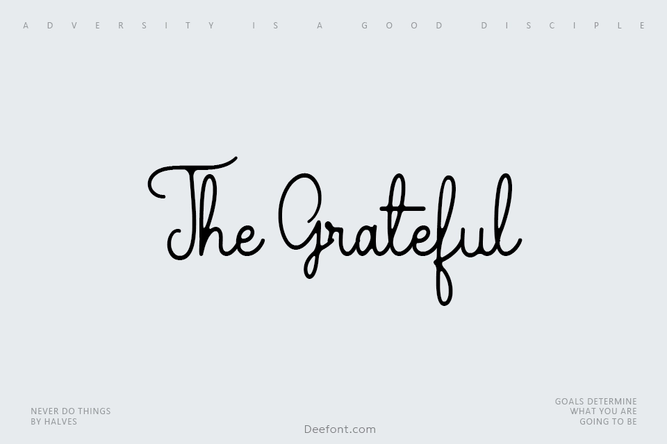 The Grateful is a classic handwritten script font featuring elegant monoline letterforms with a sophisticated yet approachable aesthetic. This versatile typeface comes in four distinct variations, offering both signature and handwritten styling options perfect for display designs, logotypes, branding, invitations, and creative projects. The font delivers a hip and modern appeal while maintaining refined elegance and visual clarity. With its smooth curves and balanced proportions, The Grateful serves as an excellent choice for adding personality and charm to typography without sacrificing sleekness or professionalism in your designs.