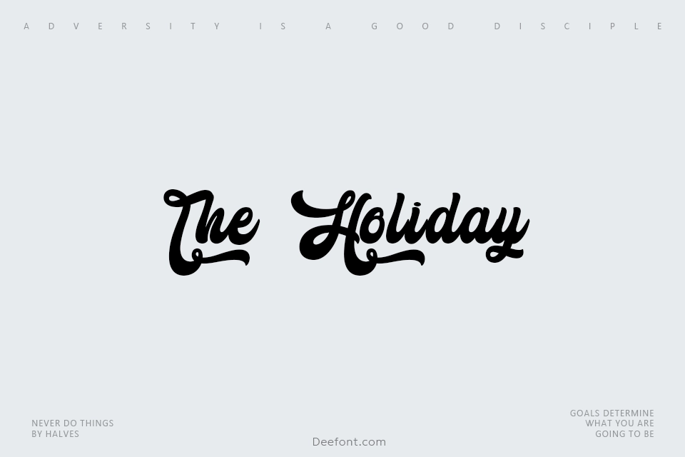 The Holiday is a bold script font featuring striking letters perfect for creating eye-catching designs. Its elegant curves make it ideal for logos, greeting cards, social media graphics, product packaging, advertising, and name tags. This decorative script typeface combines contemporary flair with classic charm, making it a versatile choice for holiday-themed projects and special occasions.