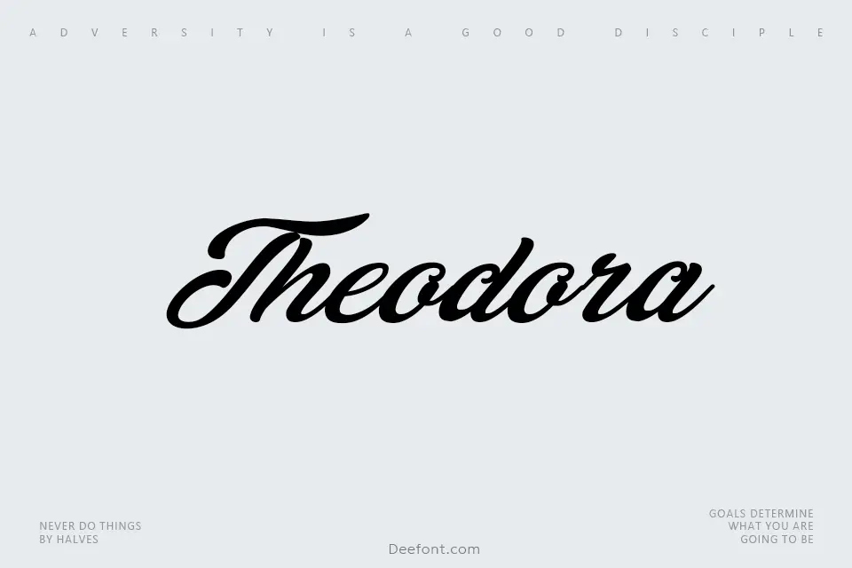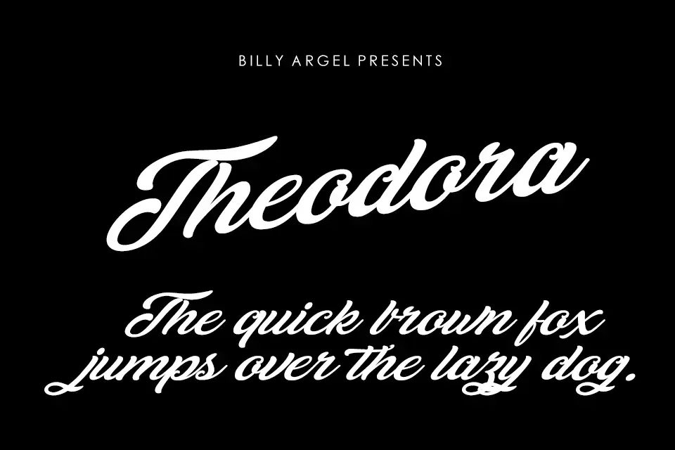 Theodora is an elegant old school script typeface combining smooth flowing visuals with consistent line styling that balances vintage charm and modern sophistication. Its fluid calligraphic letterforms feature graceful strokes ideal for magazine headers, brochures, decorative titles, posters, tattoo lettering, and social media design. The font’s harmonious blend of elegance and simplicity creates energetic yet refined typography for editorial design, product packaging, and digital projects requiring distinctive vintage-inspired aesthetics with contemporary appeal.
