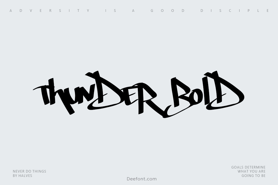 Thunder Bold is a dynamic script and graffiti font designed for personal use. This hand-lettered typeface features bold strokes and smooth lines, making it ideal for street posters, digital banners, clothing prints, and stickers. With its urban aesthetic, the font effortlessly conveys youth, freshness, and grunge appeal. Thunder Bold’s distinctive character set adds creative flair to logotypes, branding, and packaging projects. The font supports multiple languages and delivers strong visual impact for those seeking contemporary, eye-catching typography.