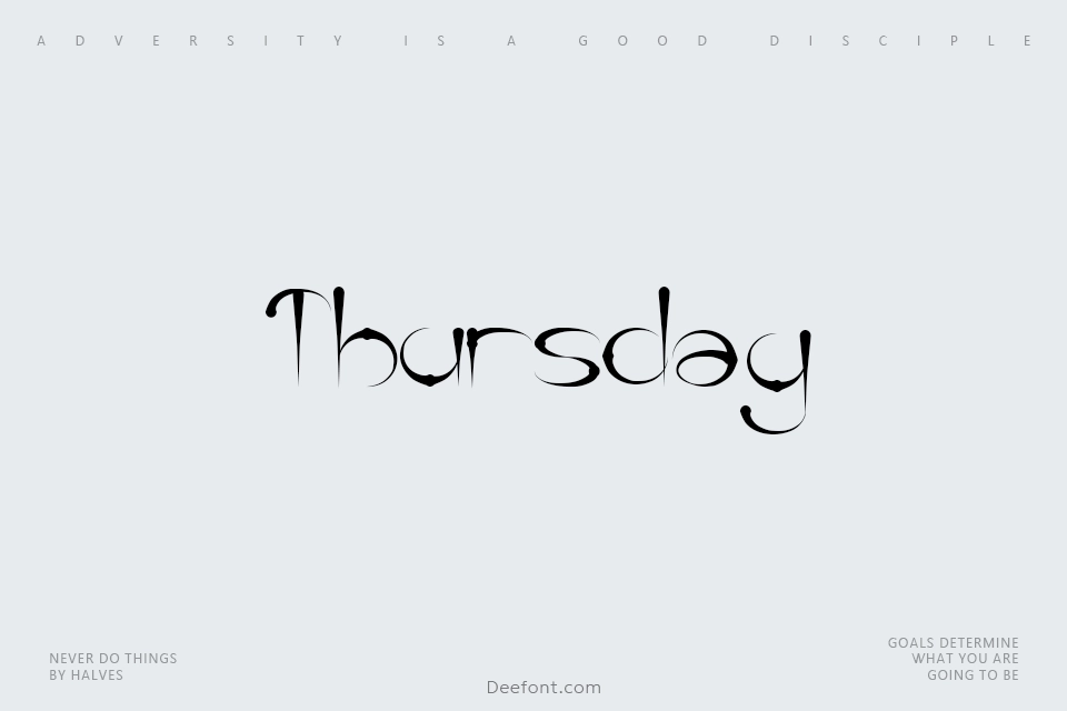 Thursday is a bold gothic display font that combines modern aesthetics with striking contemporary design. Created by Weknow Font Foundry, this typeface features clean letterforms with confident strokes, making it ideal for eye-catching headlines, posters, and creative projects. The font offers multiple styles including regular, italic, and inverse variations, providing versatility for designers seeking distinctive typography with strong visual presence and professional quality.