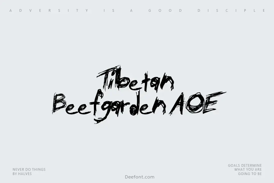 Tibetan Beefgarden AOE is an unconventional display typeface that combines scratched, distressed aesthetic with quirky character formation, creating a visually striking effect perfect for horror movie titles, Halloween promotions, and edgy graphic design projects. Its irregular letterforms and weathered appearance evoke a sense of chaos and decay, making it ideal for posters, event flyers, album artwork, and any design requiring an attention-grabbing, slightly chaotic visual impact that commands immediate viewer engagement.