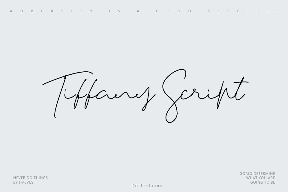 Tiffany Script is an elegant handwritten script font designed by Ardyana Putra of Ardyana Types. Featuring natural representation as a handwritten construction with simple, straightforward, and beautiful character, this font is perfect for creating signatures, brand designs, and distinctive logo applications. With 104 glyphs and multiple style variations, Tiffany Script excels in watermarks, company logos, quotes, album covers, and business cards. The font includes 132 ligatures across two types to ensure seamless letter connections, adding a luxurious and sophisticated touch to creative projects. Its charming and elegant aesthetic makes it ideal for designers seeking to elevate their work with authentic handwriting appeal.
