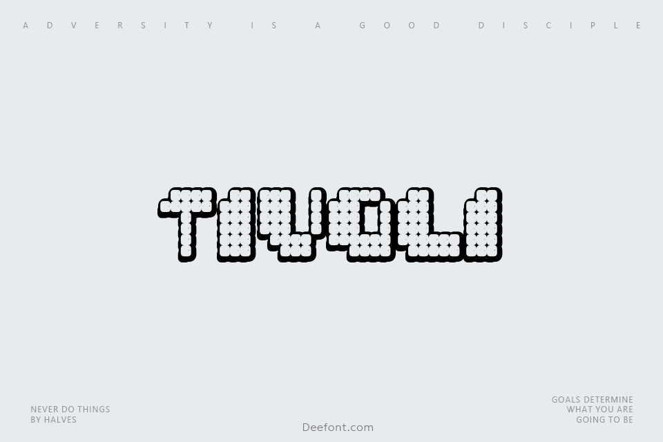 Tivoli is a playful and decorative display typeface featuring a distinctive dotted pattern that forms each character. Designed by Emil Bertell through Fenotype in 2002, this bold, outlined font combines rounded edges with uniform dot spacing, creating a three-dimensional appearance ideal for eye-catching headlines and creative projects. Perfect for children’s books, party invitations, posters, and playful branding that demands a unique and memorable aesthetic.