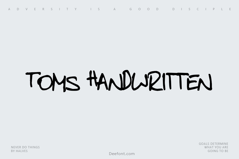 Toms Handwritten is a handwritten script font designed by Tom Bernard Anyz, offering a personal and authentic touch to your typography. This versatile handwriting-style typeface features natural pen strokes and casual letterforms that add warmth and character to creative projects. The font includes 122 glyphs with comprehensive character support for international use. Perfect for personal creative work, invitations, and casual designs, Toms Handwritten brings a friendly, approachable aesthetic to any typography project where human touch and authenticity matter.