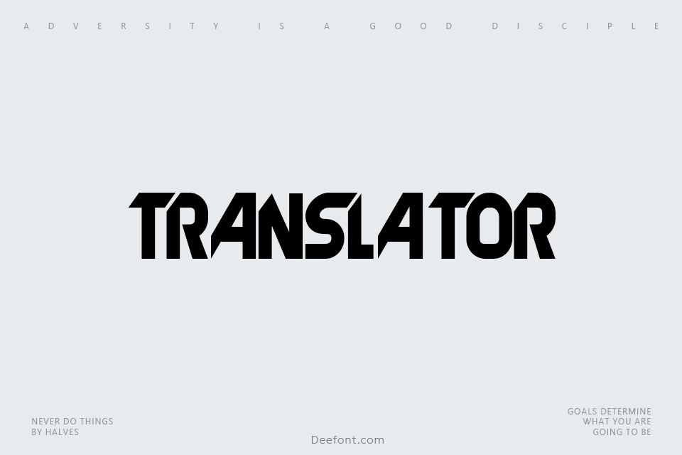 Translator is a bold and striking techno typeface designed by Vladimir Nikolic. This modern display font features geometric precision and contemporary aesthetics, making it ideal for cutting-edge design projects. With strong, clean letterforms and technical elegance, Translator delivers impactful visual communication for branding, headlines, and digital applications. The typeface combines avant-garde character with versatile functionality, supporting multiple languages across its comprehensive glyph set. Perfect for designers seeking a powerful, forward-thinking font that balances innovation with readability.