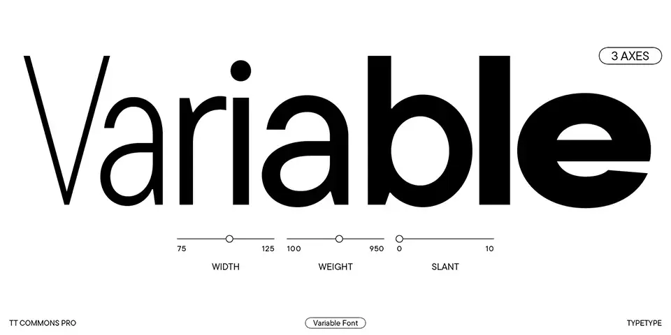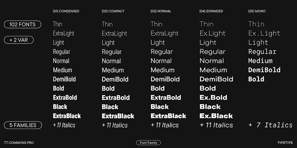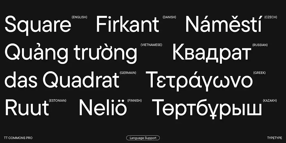 TT Commons Pro Font Family is a versatile geometric sans serif typeface designed by TypeType foundry. This bestselling typeface offers exceptional flexibility with 5 different widths, 22 styles in most subfamilies, and 2 variable fonts. It supports over 280 languages, including Greek and Vietnamese, and features an extensive character set of 1897 glyphs per style.