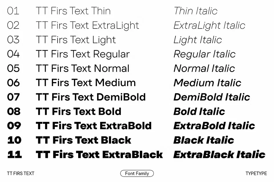 TT Firs Text Font Family is a modern geometric sans serif typeface with a Nordic character, designed to offer a perfect blend of Scandinavian minimalism and functional versatility. Developed as an evolution of TT Firs Neue, this family features 23 styles-11 roman, 11 italic, and 1 variable font-each supporting 898 characters across expanded Latin and Cyrillic scripts. With 31 OpenType features, including localization, circled numerators, and stylistic alternates, TT Firs Text Font Family is highly legible at small sizes and ideal for web, print, branding, packaging, and poster design. Its neutral yet distinctive style makes it suitable for a wide range of creative and professional applications.