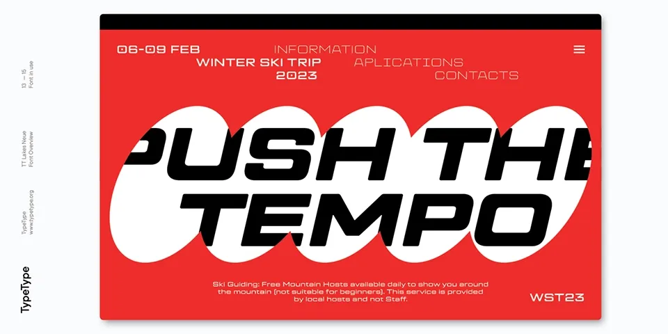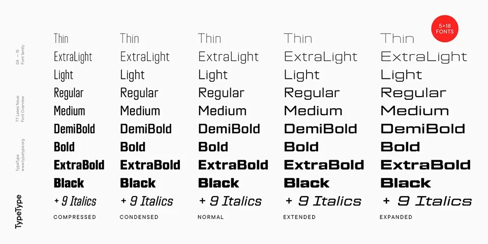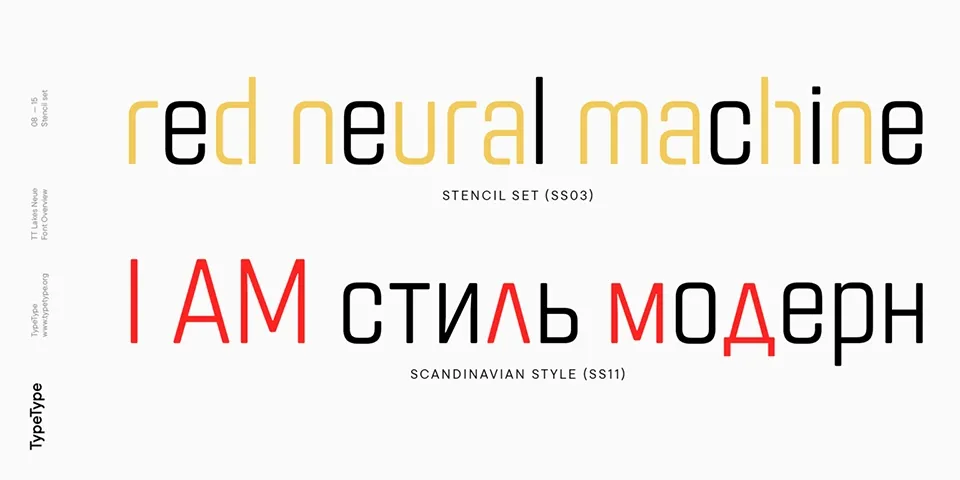 TT Lakes Neue Font Family, designed by TypeType Foundry, is a versatile geometric sans-serif typeface inspired by Finnish functionalism and historical signage from Priozersk. This comprehensive family includes 91 styles across five subfamilies: Compressed, Condensed, Regular, Extended, and Expanded. Updated to version 2.0, it features a refined character set of 921 glyphs (up from 736), variable font capabilities with weight, width, and slant axes, and 36 OpenType features. Its clean, rounded-rectangular forms and technological stylistic sets enhance adaptability for gaming interfaces, architectural signage, branding, and editorial design. The font supports over 210 languages, balancing neutrality with expressive flexibility for both digital and print applications.