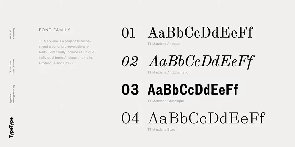 TT Marxiana Font Family is a meticulous reconstruction project of four historical typefaces originally used in the layout of the 19th-century “Niva” magazine, published by A.F. Marx in St. Petersburg. This family includes Antiqua, Antiqua Italic, Grotesque, and Elzevir styles, all faithfully crafted to preserve the authentic character, visual nuances, and typographic artifacts of the era. With an extensive glyph set and advanced OpenType features, TT Marxiana Font Family allows designers to recreate the distinctive look of late 19th-century publications using modern design tools, making it ideal for editorial, branding, and historical projects.
