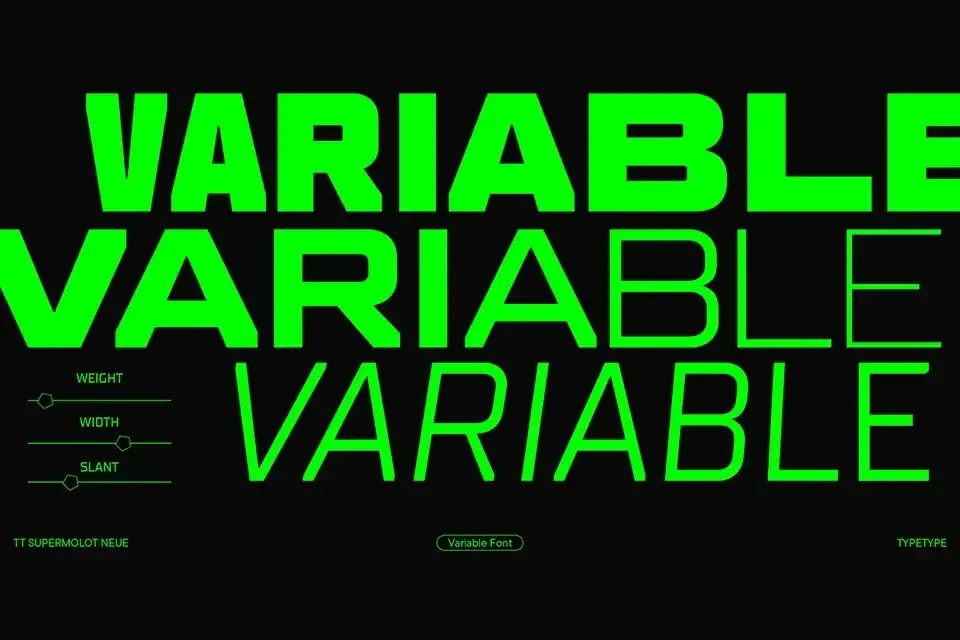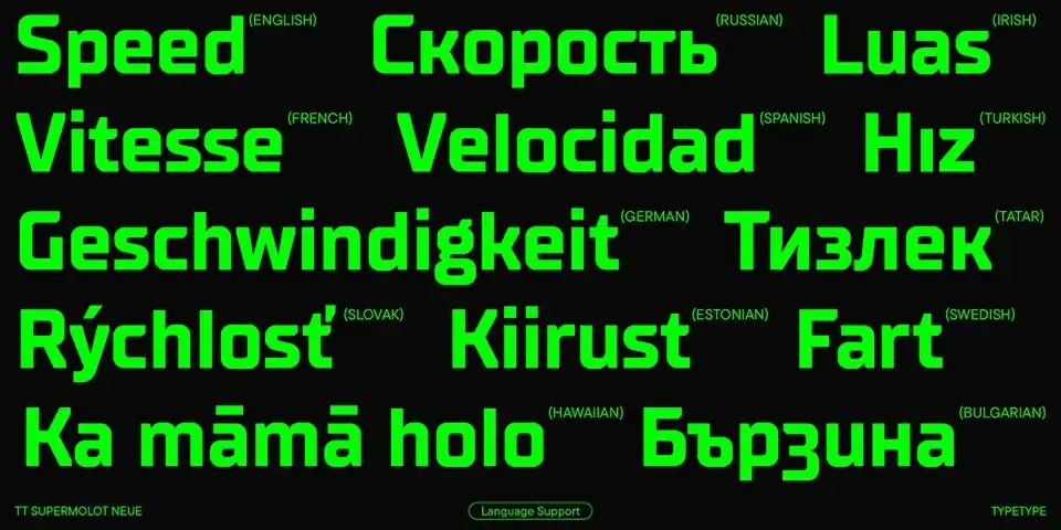 Originally created for video game interfaces, TT Supermolot Neue’s application extends to technology, automotive, architecture, and design projects. The font boasts an extensive character set supporting over 230 languages, numerous OpenType features, and special symbols like fractions and arrows.