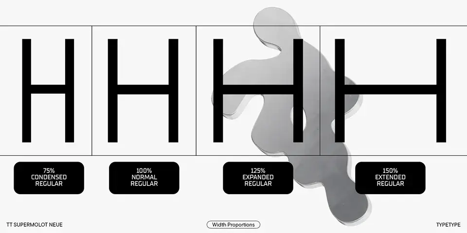 TT Supermolot Neue Font Family is a powerful and versatile sans-serif typeface designed by TypeType. This advanced, modular typeface features a futuristic aesthetic with squared forms that give it a robust appearance, while chopped angles add flexibility and ergonomics. The family includes 73 font styles across three widths – Normal, Condensed, and Extended – each offering 9 weights from Thin to Black with matching italics.