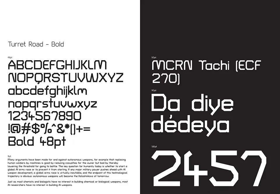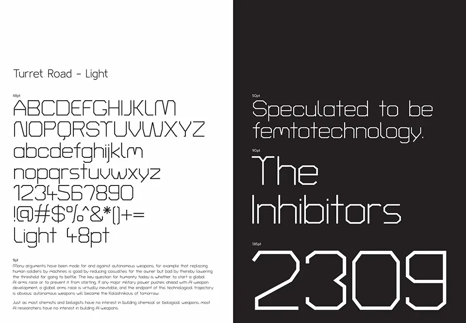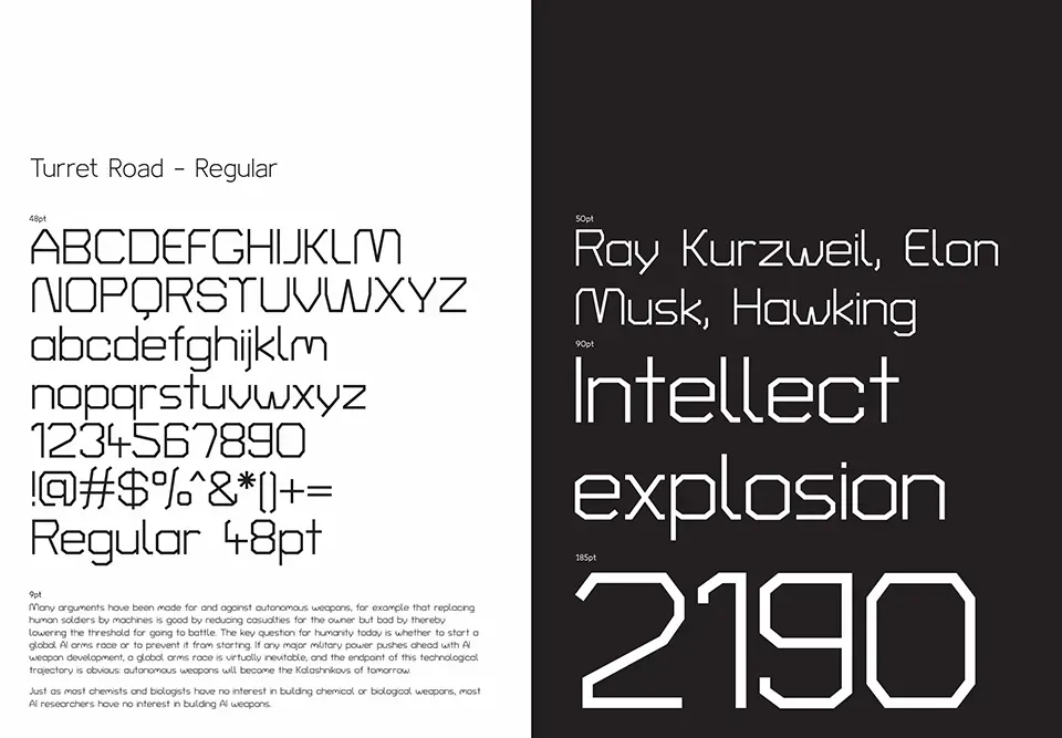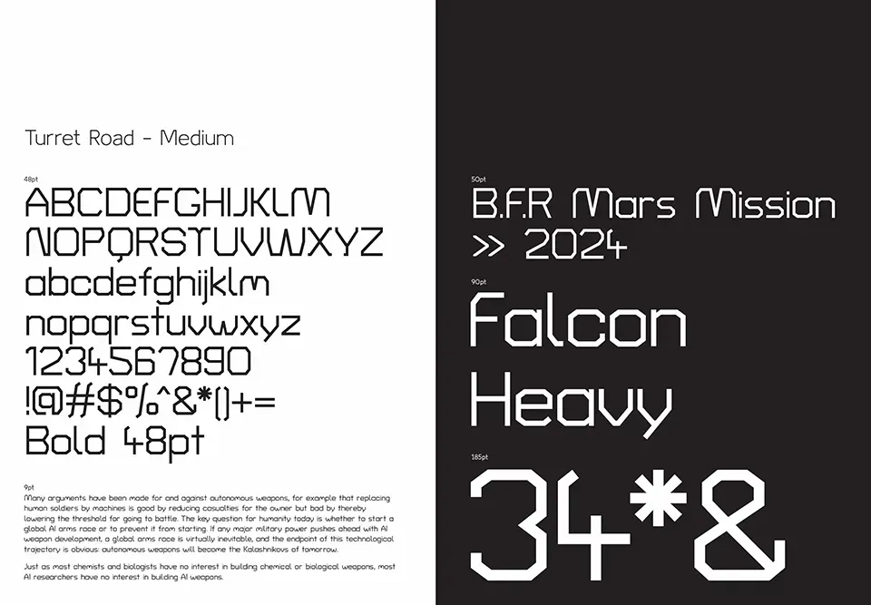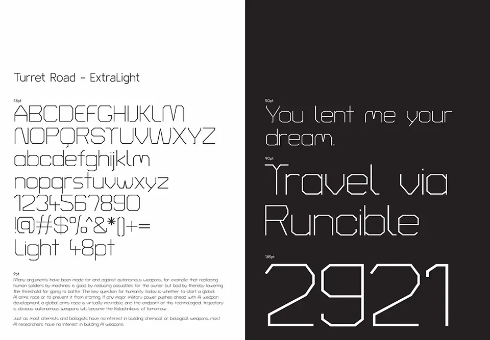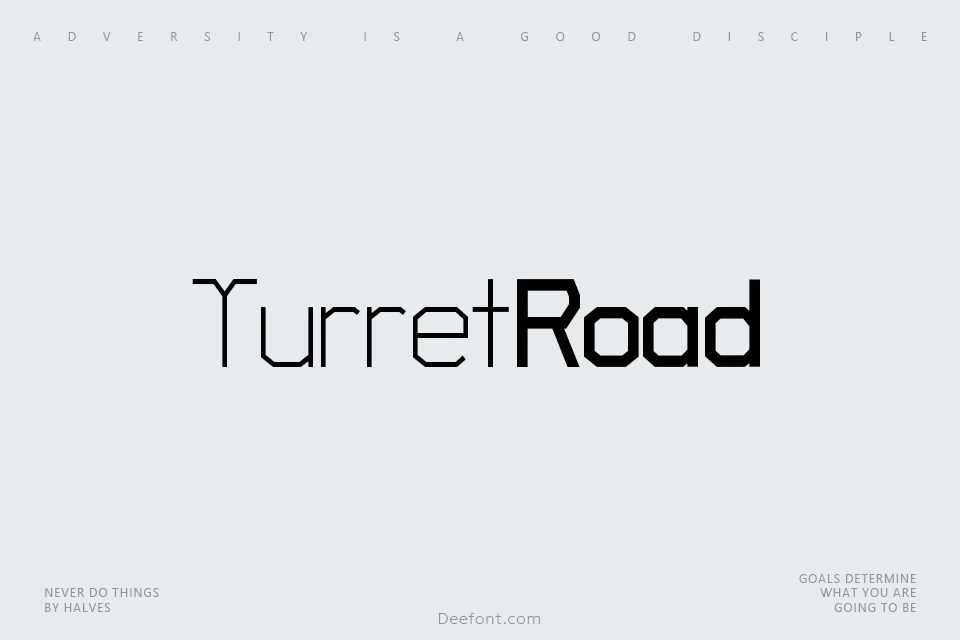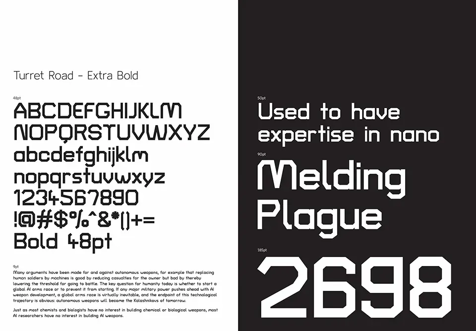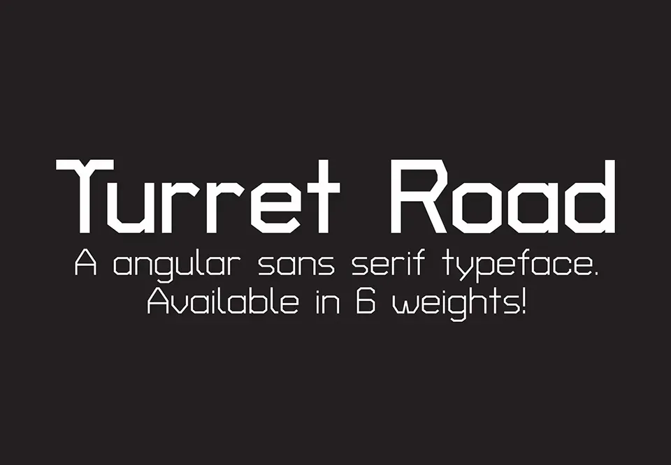 Turret Road Font Family is a striking geometric sans serif typeface characterized by its very low contrast, high x-height, and playful diacritics. This modern font features clean lines, sharp angles, and a distinctive digital aesthetic that makes it perfect for contemporary design projects. Available in six weights from ExtraLight to ExtraBold, Turret Road offers excellent versatility for various applications. Its futuristic appearance makes it ideal for tech branding, digital interfaces, video game graphics, and modern posters. The font’s balanced structure ensures high legibility while maintaining a unique personality that stands out in headlines and display text. Turret Road seamlessly blends technological edge with sophisticated design, making it a valuable addition to any designer’s toolkit.