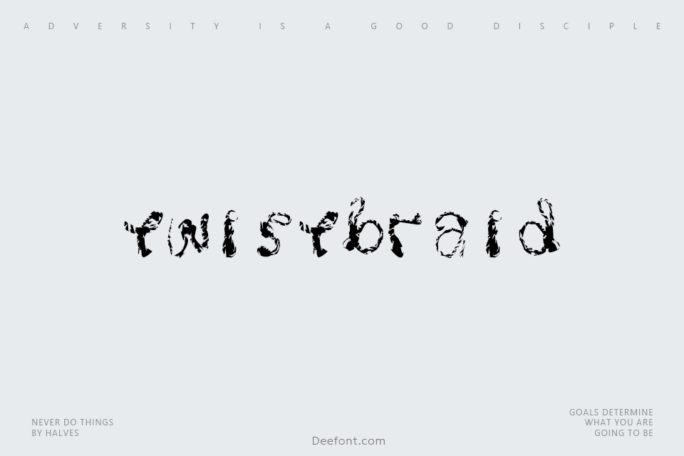 Twistbraid is a playful and decorative display font that draws inspiration from braided and twisted patterns. Designed with a whimsical, slightly distressed aesthetic, each character features unique organic forms that suggest handmade craftsmanship. The font combines rustic and decorative elements, making it ideal for creative projects that require a distinctive, eye-catching visual presence. Its irregular structure and chaotic charm add personality to posters, logos, and artistic designs. Perfect for designers seeking fonts that blend elegance with playful energy.