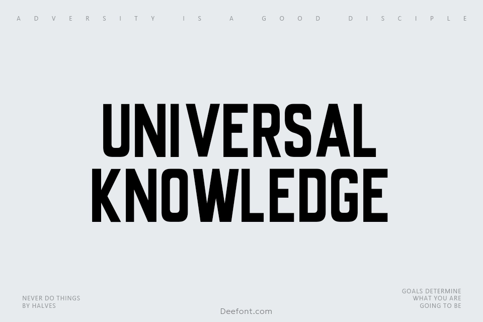 Universal Knowledge is a bold, sans serif font featuring futuristic character designs perfect for headlines, logos, and display purposes. Created with a contemporary aesthetic, this typeface offers versatility for creative projects including movie titles, games, apps, flyers, and branding materials. With clean lines and striking presence, Universal Knowledge delivers modern sophistication while maintaining approachable readability for diverse design applications.