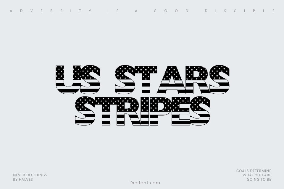 US Stars N Stripes is a distinctive decorative flag font designed for patriotic and festive projects. Featuring American stars and stripes integrated into each letter, this free font offers uppercase characters exclusively, making it ideal for bold headlines and eye-catching designs. Perfect for projects celebrating American heritage, Independence Day campaigns, or patriotic branding, the font brings vibrant national flair to your typography. With its straightforward execution and recognizable patriotic elements, US Stars N Stripes stands out as a creative choice for designers seeking thematic, decorative lettering solutions that evoke American pride and festive spirit.