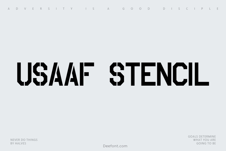 USAAF Stencil is a distinctive stencil-style typeface featuring military-inspired letterforms with characteristic cutout gaps. This display font captures the essence of United States Army Air Forces markings, delivering bold, geometric characters perfect for vintage designs, aviation-themed projects, posters, and retro graphics. Ideal for designers seeking authentic military aesthetics and industrial-strength typography.