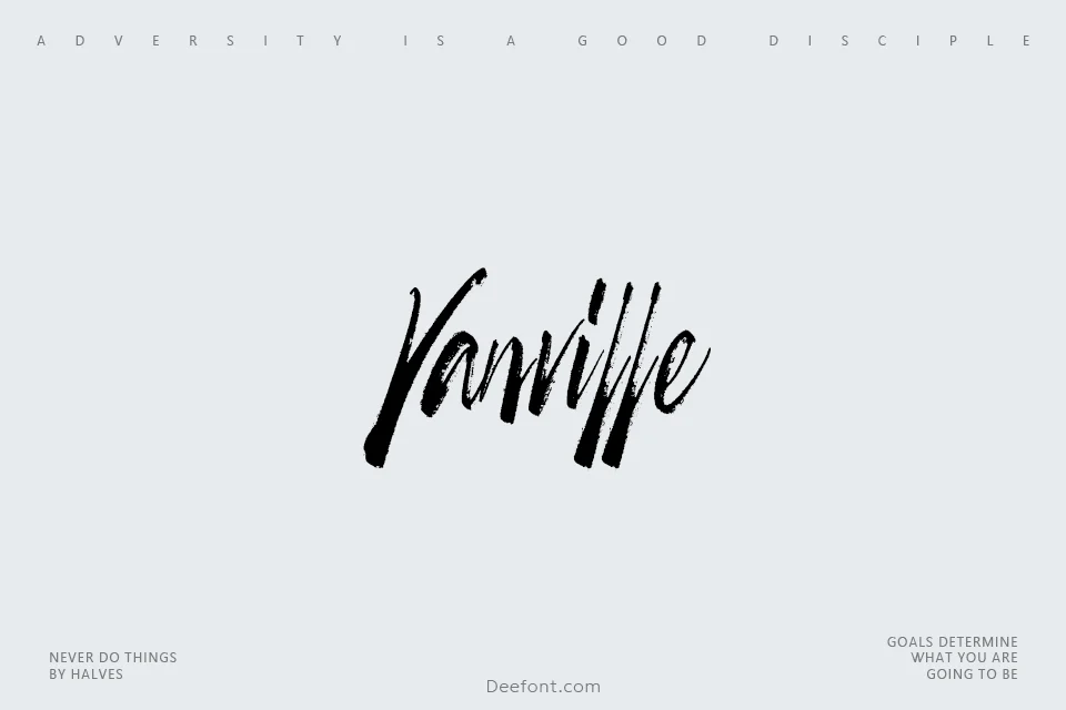 Vanville is an elegant brush script font featuring artistic handwritten-style letterforms. This typeface combines bold and thin strokes with an irregular baseline, delivering expressive textured characters perfect for personal branding, logos, headers, and creative projects. The semi-light condensed design creates a modern aesthetic suitable for elegant typography applications.