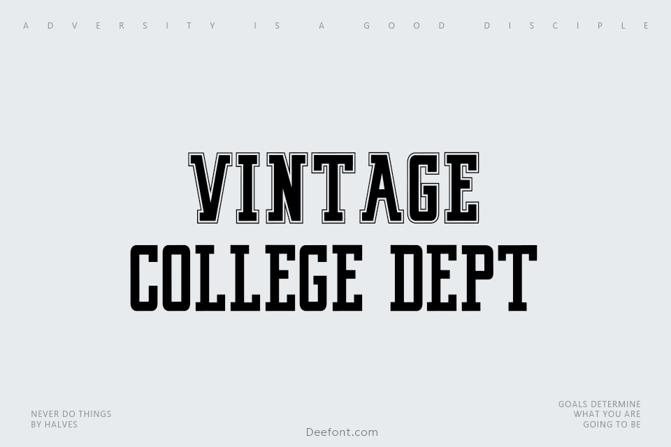 Vintage College Dept Font is a bold, condensed slab serif typeface with a distinctly retro aesthetic that captures the essence of classic collegiate and varsity design. This display font features blocky, easily readable letters infused with vintage charm, evoking the spirit of old-school American university insignias and sports paraphernalia. The font’s condensed proportions and strong presence make it ideal for headlines, logos, and designs that require impactful typography with nostalgic appeal, offering both outlined and worn variants to suit creative project needs.