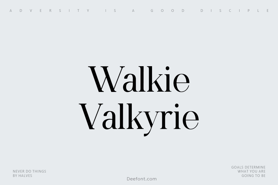 Walkie Valkyrie is an elegant and sophisticated modern serif font family featuring nine distinct weights. This classically refined typeface combines pronounced serifs with graceful curves and dynamic rhythm between thick and thin strokes, making it ideal for luxury branding, editorial design, wedding projects, magazine covers, and high-end product packaging. Its balanced proportions deliver both visual impact and refined legibility suitable for headlines, titles, and signature applications requiring timeless elegance.